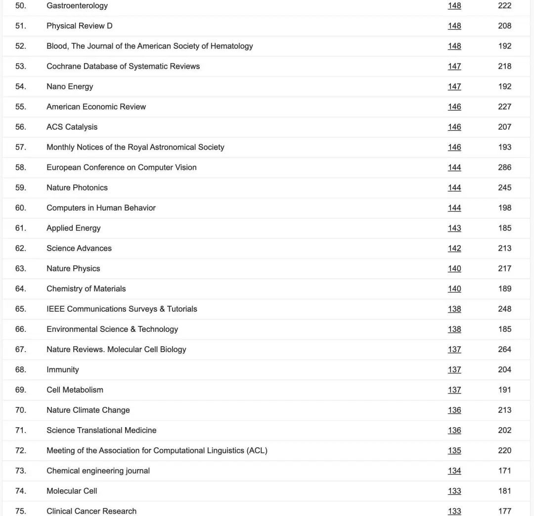 谷歌发布了2021年学术期刊和会议的最新排名。近日,谷歌发布了2021年学术期刊和会议的最新排名。今年整体榜单前三依然没有悬念。自然再次获得第一,NEJM排名第二,科学排名第三。虽然AI学术峰会继去年上榜后,今年又刷新纪录:——CVPR从去年的第五位跃升至第四位,五年来首次超过《柳叶刀》。